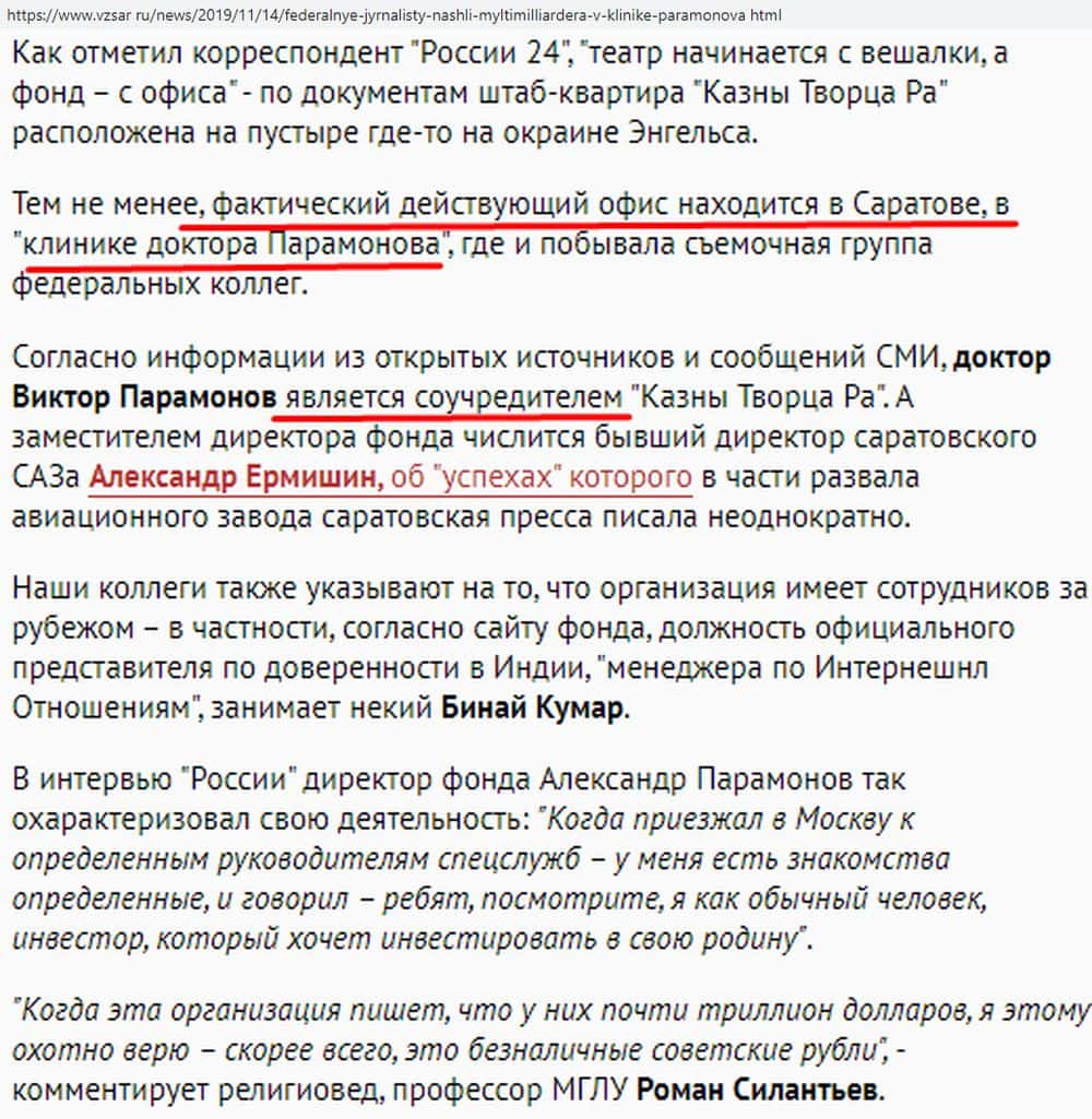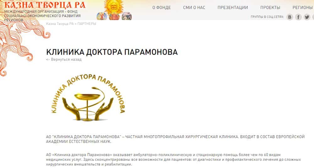 Прародители всех лохотронов Казна Творца РА имеют самую прямую связь с лицемерами Клиника Доктора Парамонова. Мало того, что владелец недоклиники является учредителем доморощенного фонда Казна Творца РА, так еще и сама псевдобольница Клиника Доктора Парамонова является гнездом для всего этого змеиного кубла.
