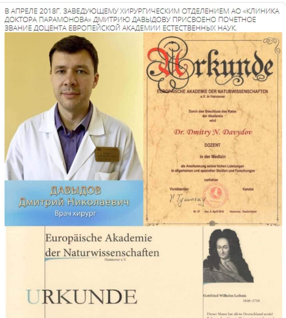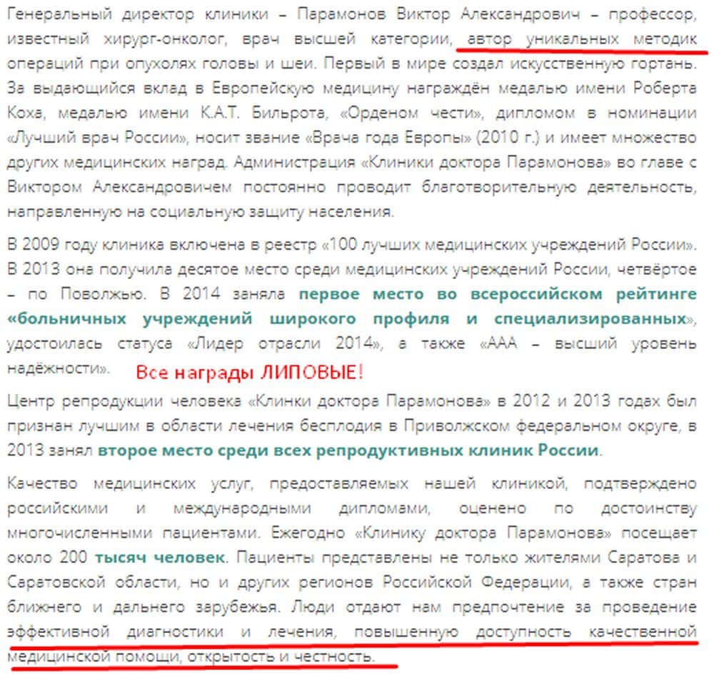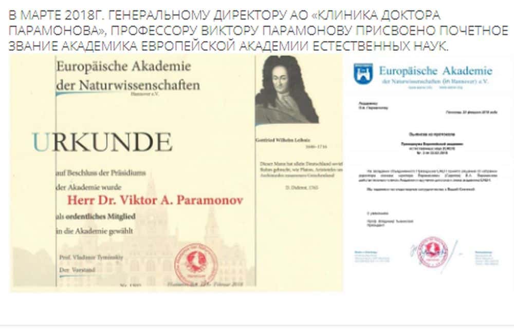 Самохвальство проходимцев Клиника Доктора Парамонова не знает границ - и у владельцев, и у специалистов есть куча фиктивных наград. Например, у заведующего так называемым хирургическим отделением есть звание доцента от Европейской Академии Естественных Наук - такой статьи в указанном заведении даже нет.