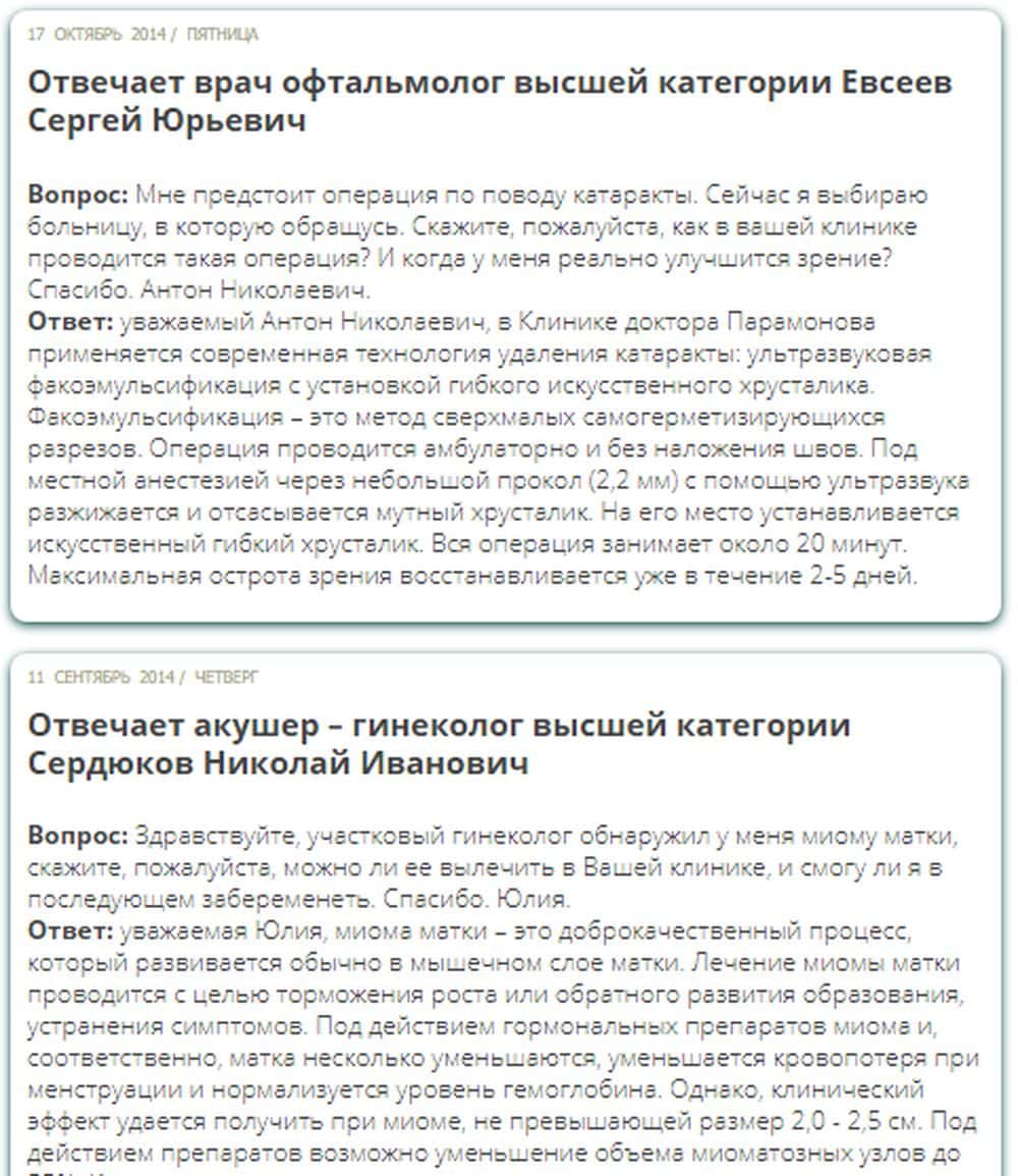 Еще один раздел-фикция это вопросы и ответы. Здесь якобы специалисты Клиника Доктора Парамонова отвечают на вопросы от пациентов. На самом деле все вопросы фиктивные, а ответы продуманы так, чтобы вводить в заблуждение будущих жертв. Они, как на подбор, касаются именно самых дорогостоящих и востребованных услуг.