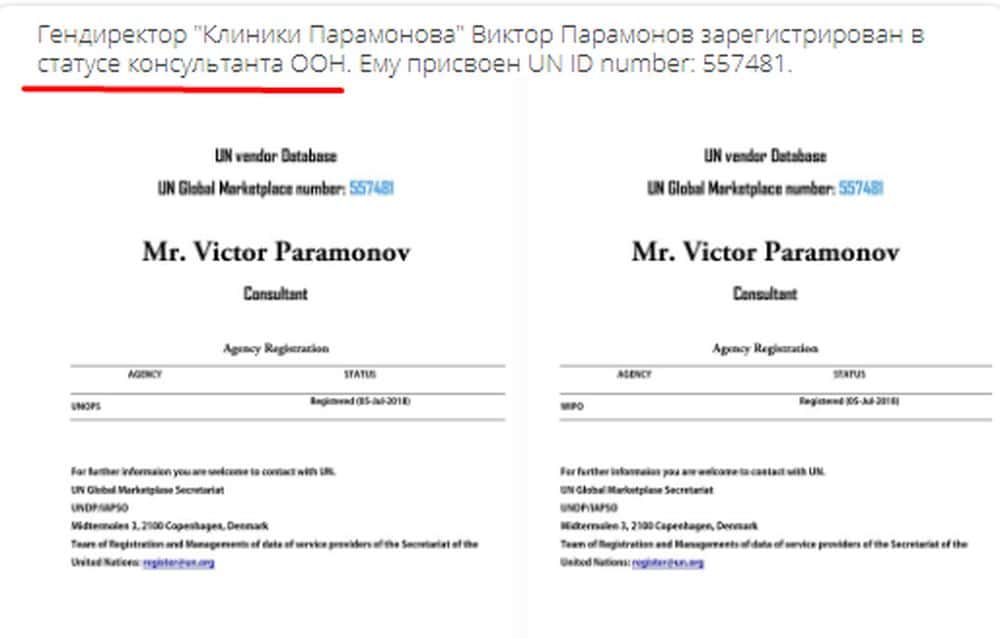 Но и на этом председатель лохопритона Клиника Доктора Парамонова не остановился. Его самомнение периодически улетает в космос, что не удивительно, если вспомнить, с какими скам-проектами он связан (речь о лохотроне Казна РА). В духе остальных афер шараги владелец Клиника Доктора Парамонова приписал себе статус консультанта ООН.