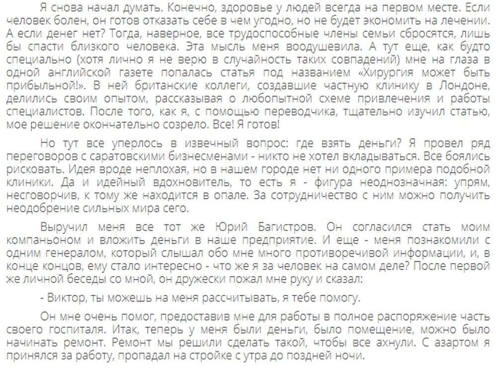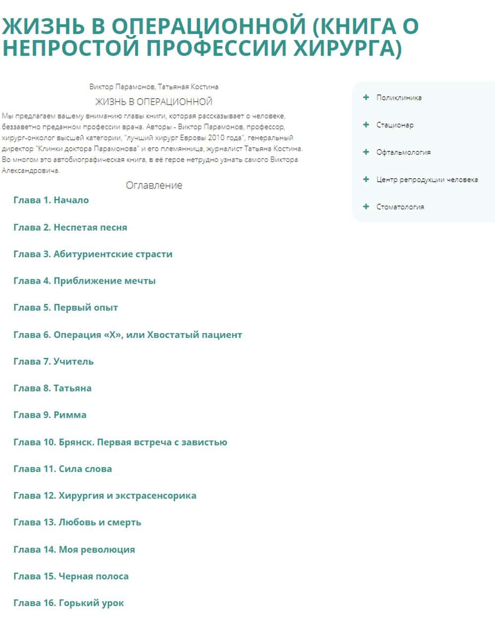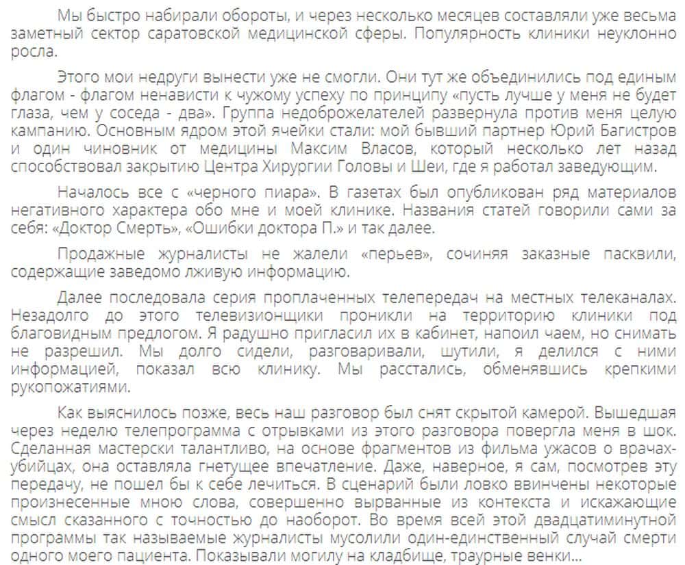 В книжонке, правда, есть одна странность - фамилия врача, от имени которого ведется повествование, не совпадает с фамилией генерального директора аферы Клиника Доктора Парамонова. Зато там подробно описано, как ему бедному завидовали и травили поддельными сюжетами на телевидении - это о жалобах на смерти в клинике по вине персонала.