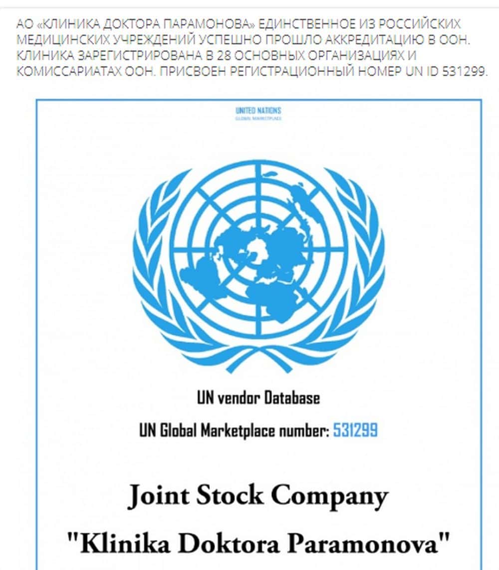 Но махинаторы Клиника Доктора Парамонова пошли дальше. Чтобы придать своему скам-проекту еще больше веса, они написали, что их богодельня является единственной медорганизацией, получившей аккредитацию ООН и даже зарегистрирована в 28 комиссариатах. Ну, если учесть, что таких аккредитаций в принципе не существует, то да.