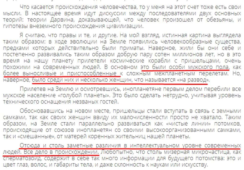 В последнем разделе книги начинается блошиный цирк с вкраплениями самохвальства и сексизма. Автор высказывает свою теорию происхождения человечества. Но он, видимо, произошел от пары приматов, раз даже не подумал о том, что особи с разным кодом ДНК не могут иметь потомства - тут и в его компетенции врача начинаешь сомневаться.