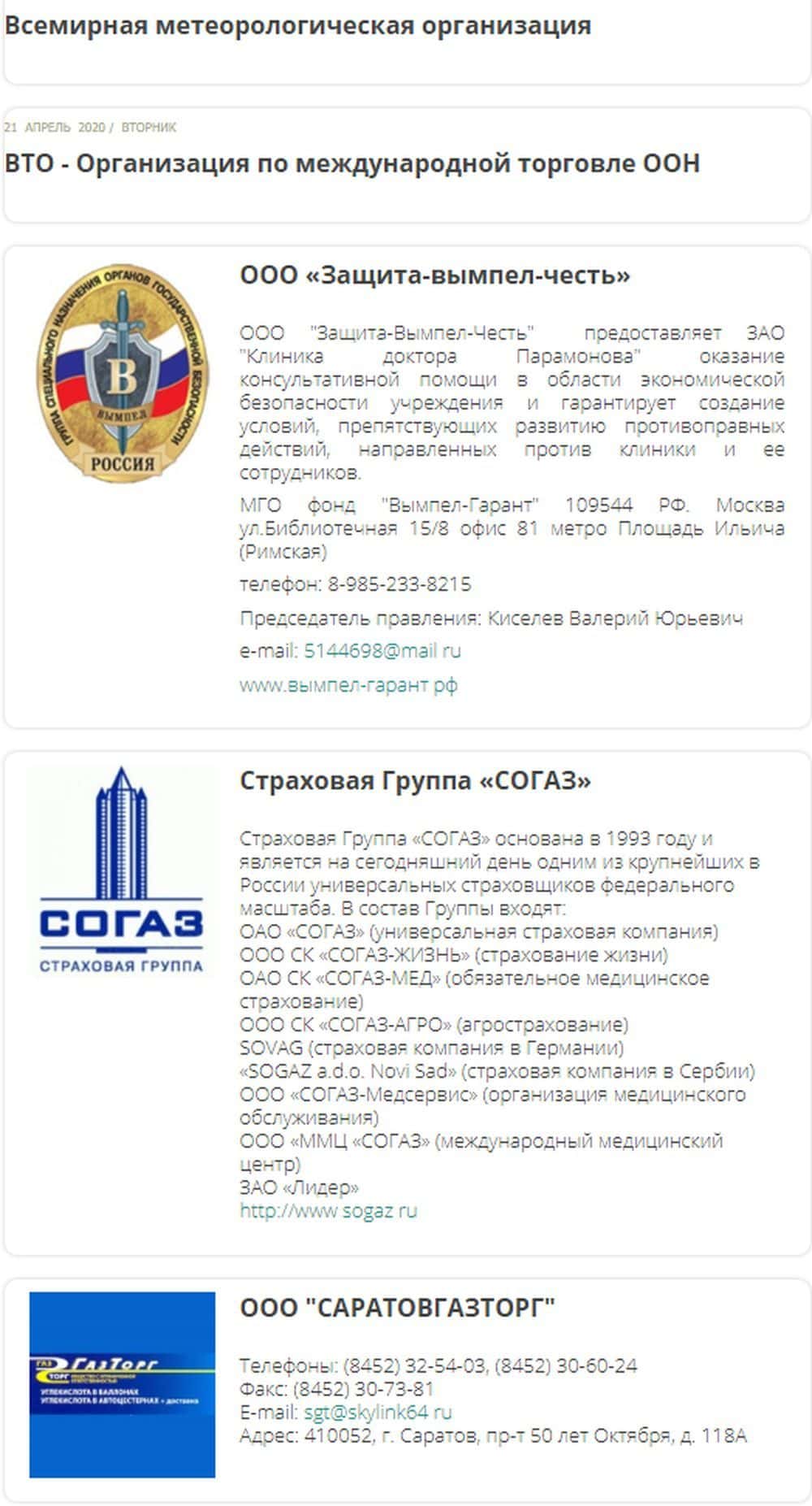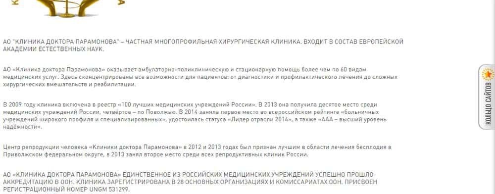 Постарались наполнить по максимуму жулики Клиника Доктора Парамонова и раздел с отзывами в прессе. Правда, не тем, чем надо - отзывы о собственно клинике есть только на первой странице. И то, написаны они под заказ, а настоящие отзывы пациентов не столь радужны. Остальные страницы заполнены просто новостями города Саратов.