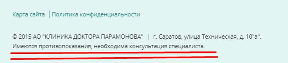 Но настоящее клиентское соглашение - не в этом документе, а в футере сайта. Там жулики Клиника Доктора Парамонова, прям под названием и адресом своей шарашки, четко написали: "имеются противопоказания, необходима консультация специалиста". Вот это правда - вся их скам-контора сплошное противопоказание, а специалистов в нее не подвозили.