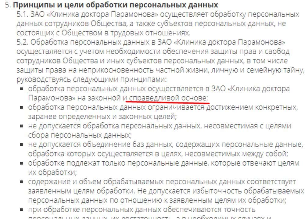 В официальном документе жулики Клиника Доктора Парамонова с полной серьезностью заявляют, что персональные данные будут обрабатываться на справедливой основе. Что это вообще такое, "справедливая основа"? Далее, они перечисляют варианты, при которых личная информация может быть раскрыта, и добавляют "в иных целях".