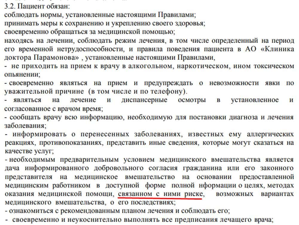 На сайте проходимцев Клиника Доктора Парамонова есть документ с порядком оплаты, в котором прописаны права и обязанности пациентов. Составлен он хитро и не защищает потенциальных жертв от халатности и беспринципного обворовывания со стороны разводил, для которых самая главная цель - набить карманы и избавиться от пациента.