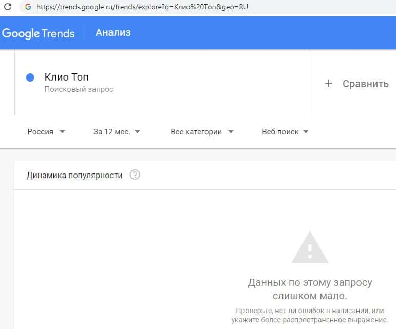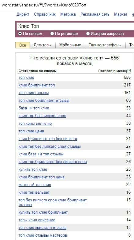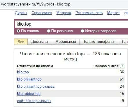 Русскоязычный вариант брендового имени "Клио Топ", вбиваемого с одним пробелом в поисковом сервисе Яндекс.Вордстат, набрал 556 значений по запросам за месяц.