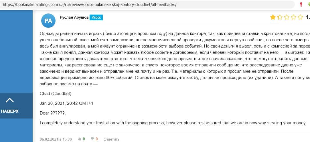 Отзывы клиентов букмекерской конторы Клоуд Бет о реалиях сотрудничества с ней