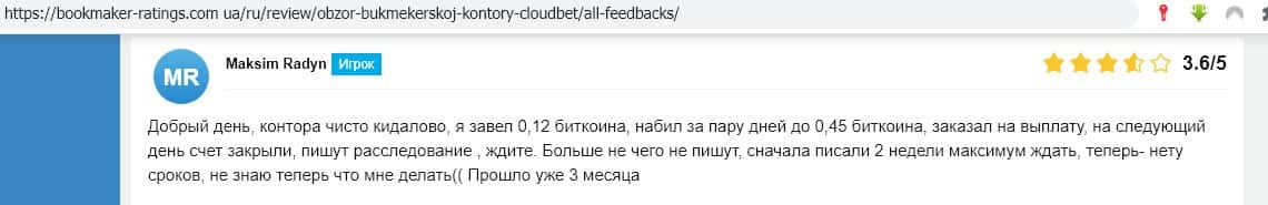 О куче всевозможных уловок, используемых жуликами Клоуд Бет, что бы не платить своим клиентам, делится в своем отзыве клиент этой конторы на портале bookmaker-ratings com.