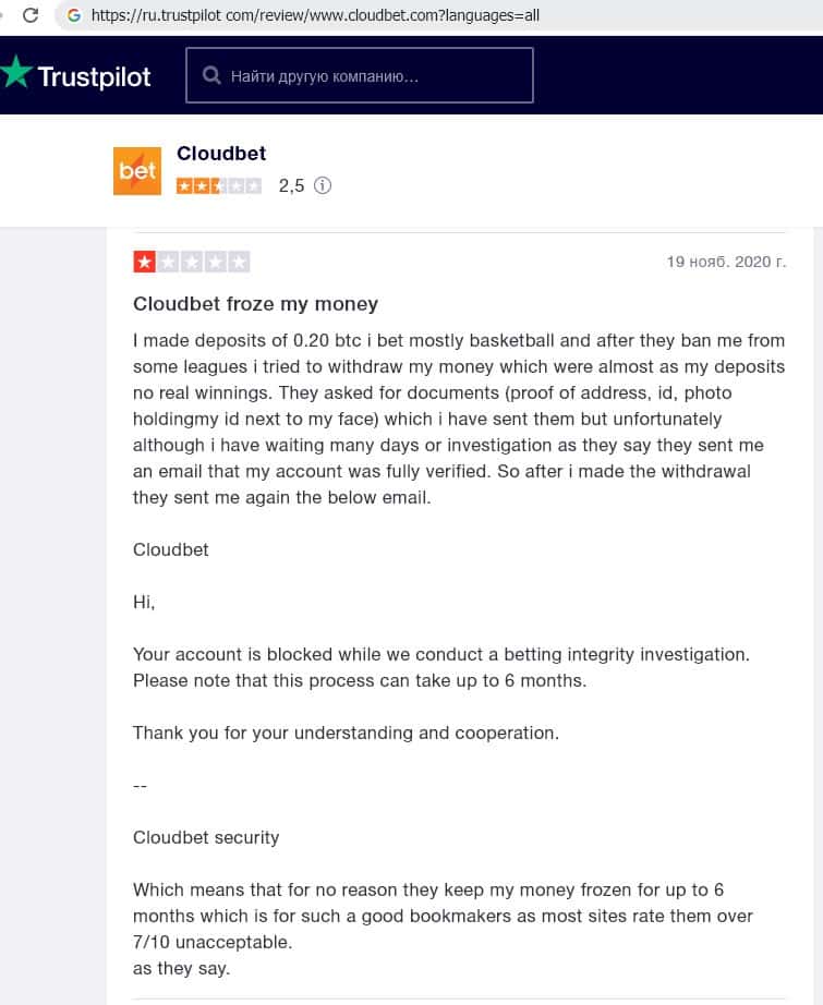 На портале trustpilot клиент этой букмекерской конторы описывает, как потерял на их ресурсе 0,27 btc. Его аккаунт сначала был заблокирован, а в последствии удален.