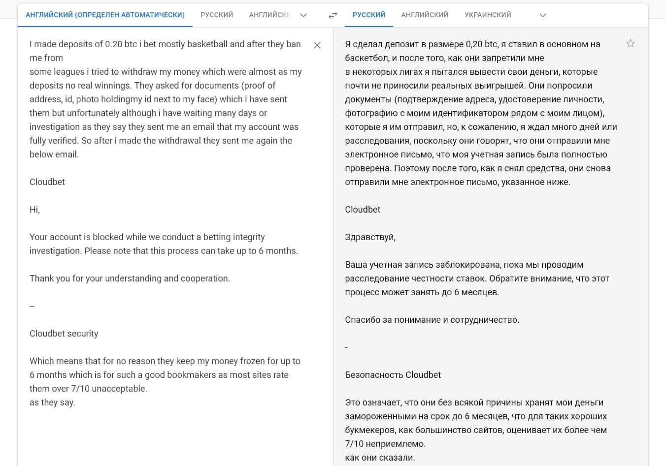 Очередной игрок, выигравший на ставках в букмекерской конторе Клоуд Бет, жалуется, что не может получить свой выигрыш. Сначала причиной не выплаты была верификация.
