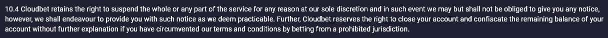В п.7.2.6 пользователя букмекерской конторы Клоуд Бет предупреждают о возможном его отключении от сервиса по любому поводу и подозрению.
