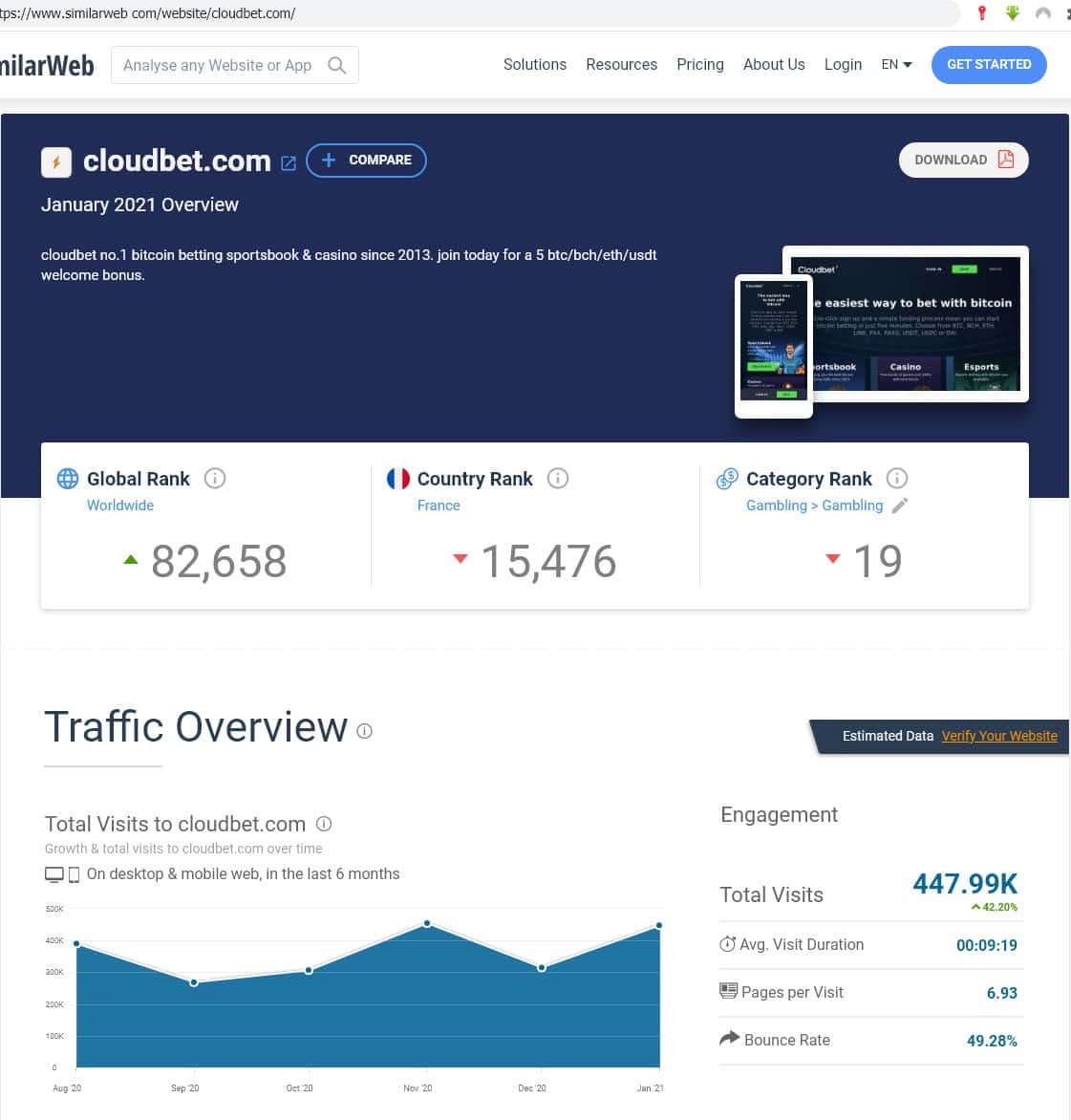 Как свидетельствует портал similarweb, у букмекерской конторы Клоуд Бет довольно неплохие показатели посещаемости ресурса на уровне 270-450 тысяч посещений в месяц.