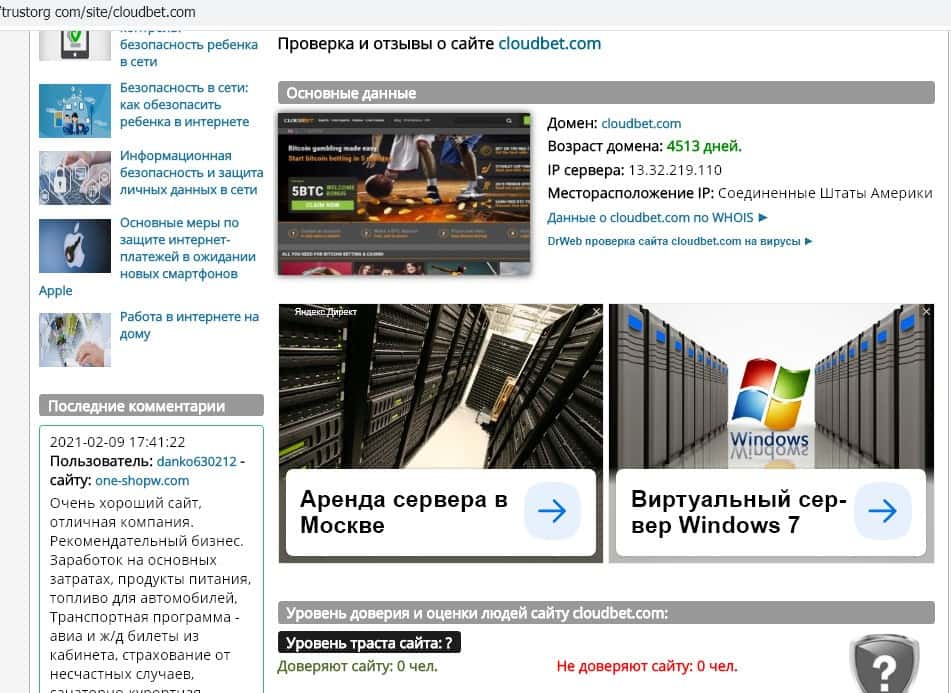 - Оценка доверии к сайту букмекера Клоуд Бет на портале trustorg
