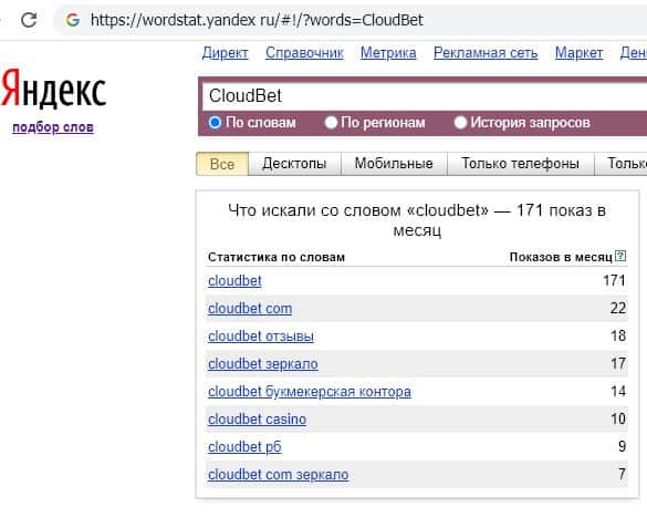 Анализ брендовых запросов о букмекерской конторе CloudBet на поисковом сервере Яндекс