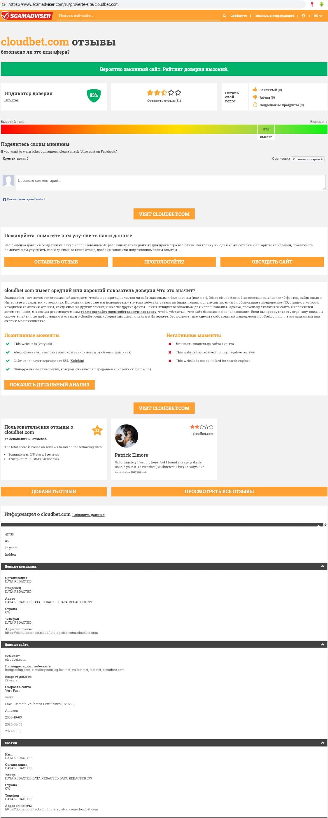 Несмотря на общую довольно высокую оценку доверия к порталу жуликов Клоуд Бет, сервис scamadviser выделяет наличие негативных отзывов о ресурсе и сокрытие данных о его хозяевах.
