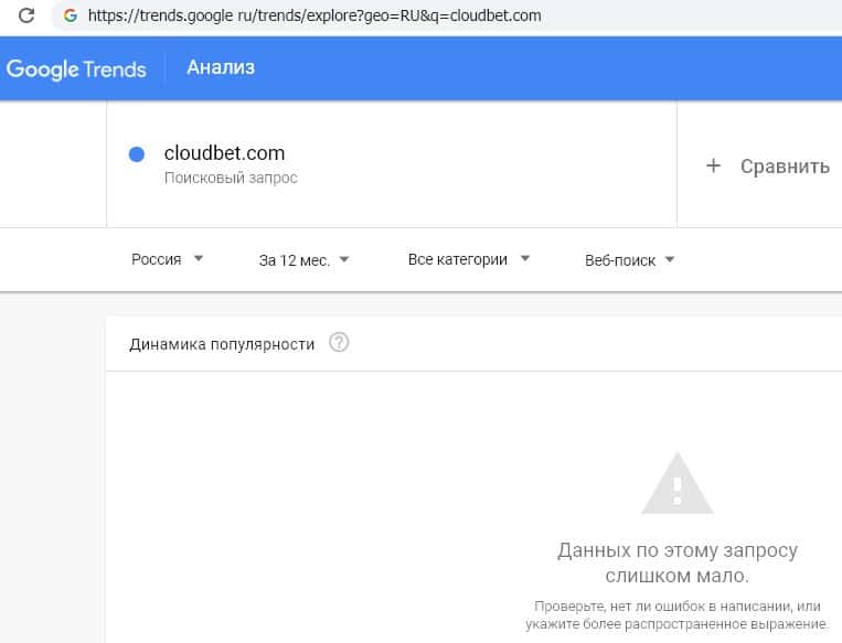 Поисковые запросы портала букмекерской конторы "cloudbet.com" также не пользуются популярностью в поисковой системе Google. О наличии таковых данные отсутствуют.