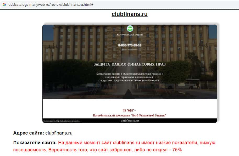 - Сайт конторы Клуб Финансовой Защиты не пользуется особой популярностью