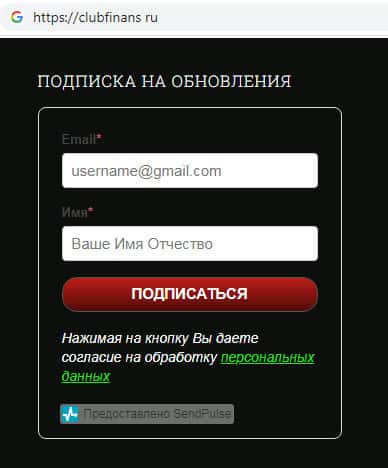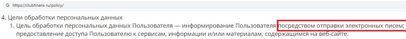 Жулики ClubFinans Ru в обязательном порядке у пользователя попросят указать свой адрес электронной почты с той целью, чтобы рассылать электронные письма рекламного характера. Все это осуществляется для того, чтобы втереться в доверие к пользователям своего сайта и создать иллюзию сотрудничества.