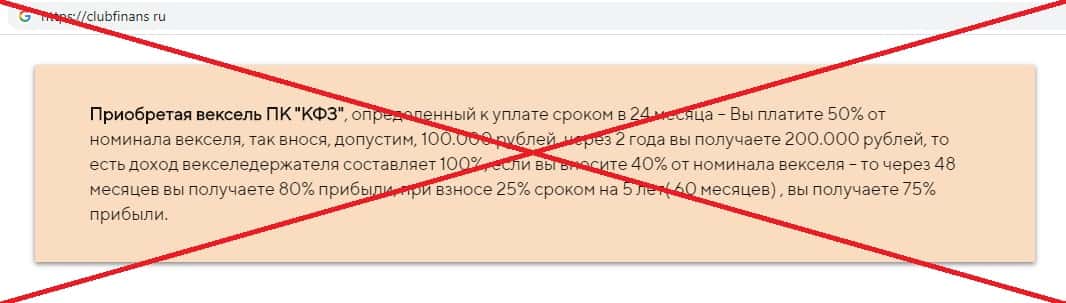 Мошенники ClubFinans Ru в очередной раз утверждают, что покупая их якобы ценную бумагу под названием вексель якобы можно эффективно сберечь свои денежные средства и получить в придачу проценты. Такого рода инвест-лохотроны как Клуб Финансовой Защиты работают не долго и закрываются в тот же день, когда собрали достаточно денежек.