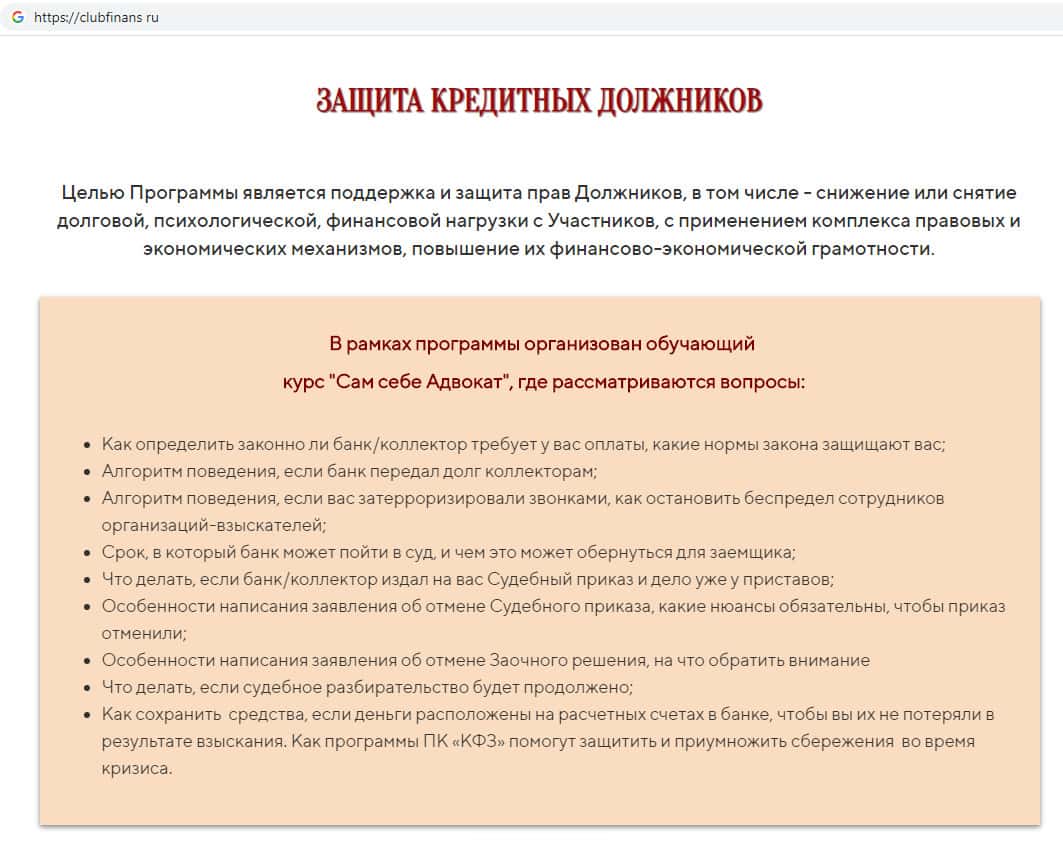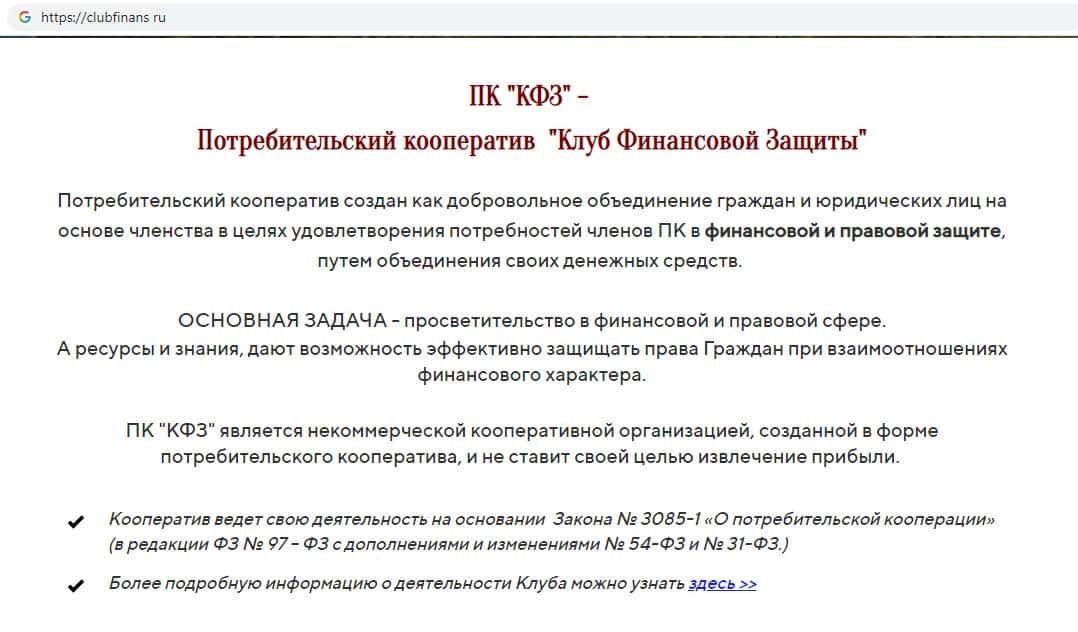 Обзор официального интернет-ресурса аферистов Клуб Финансовой Защиты