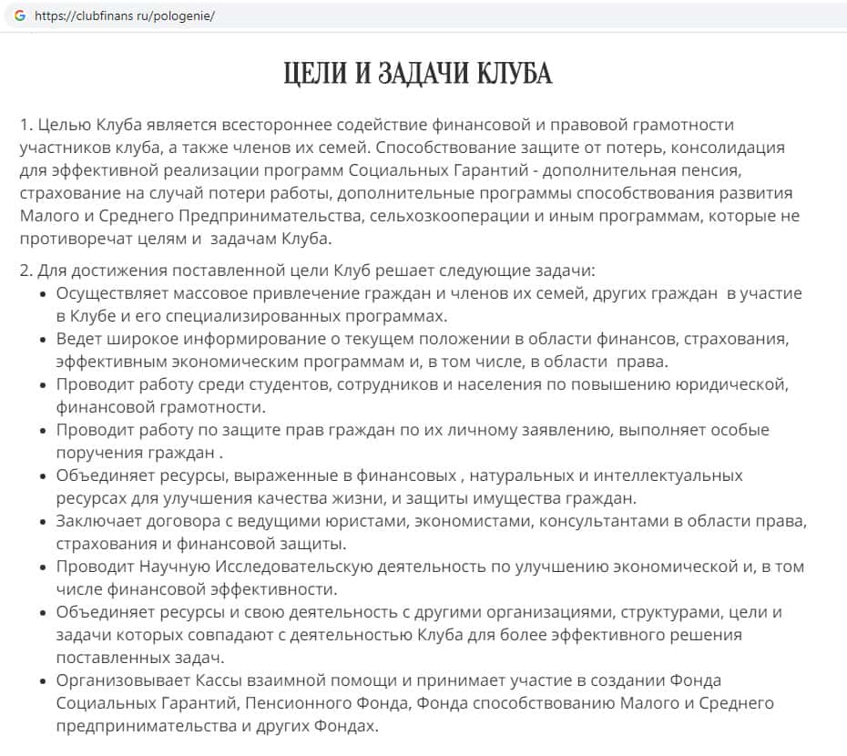 Аферисты ClubFinans Ru на своем официальном сайте опубликовали достаточно информации, в достоверности которой можно очень сильно засомневаться. Здесь указана информация о том, что клуб основывается на законодательстве СССР, которое вероятнее всего давно потеряло свою силу. Нет никакого подтверждения того, что это правда.