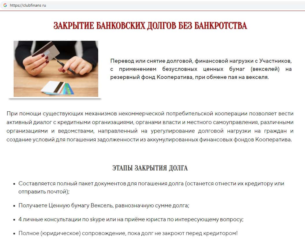 Жулики ClubFinans Ru создают лишь видимость надежности их компании, рассказывая о том, как должникам раздать кредиты. Для этого мошенники начнут рекомендовать пострадавшему купить предлагаемые ими документы о том, что компания якобы обязуется вернуть 50% от вложенной суммы. В итоге человек потеряет намного больше денег, чем кажется.