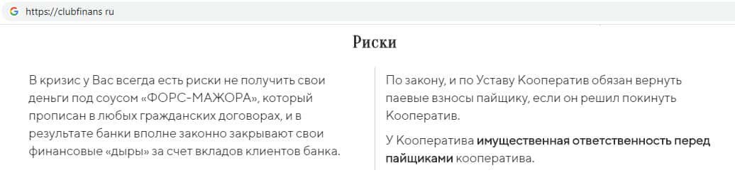 - Информация о всевозможных рисках потери денежных средств на сайте шараги ClubFinans Ru