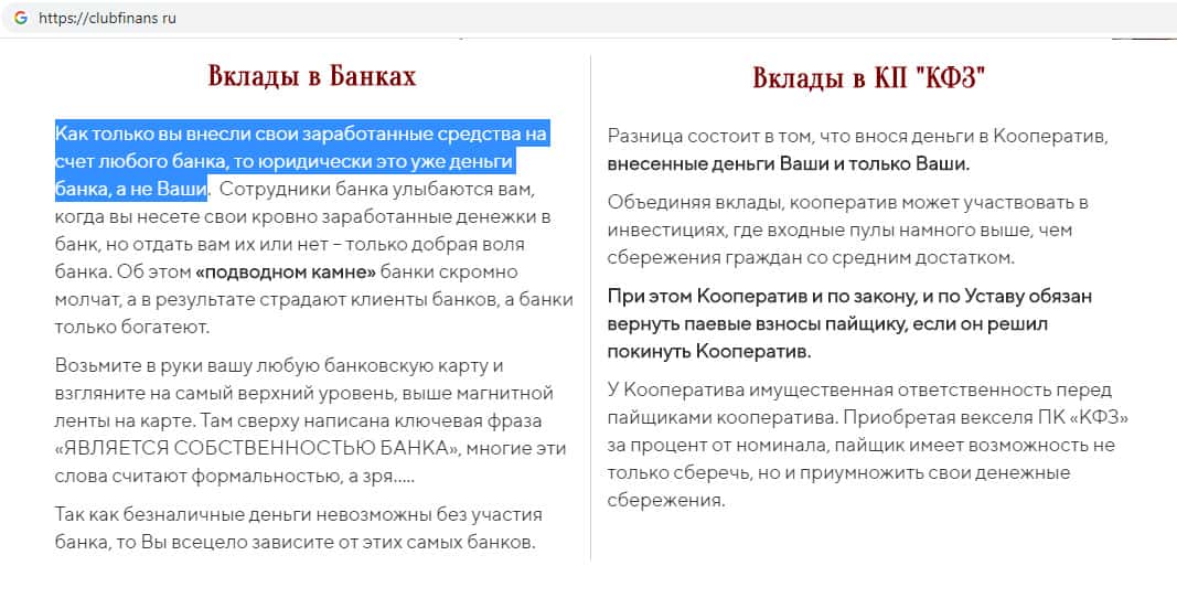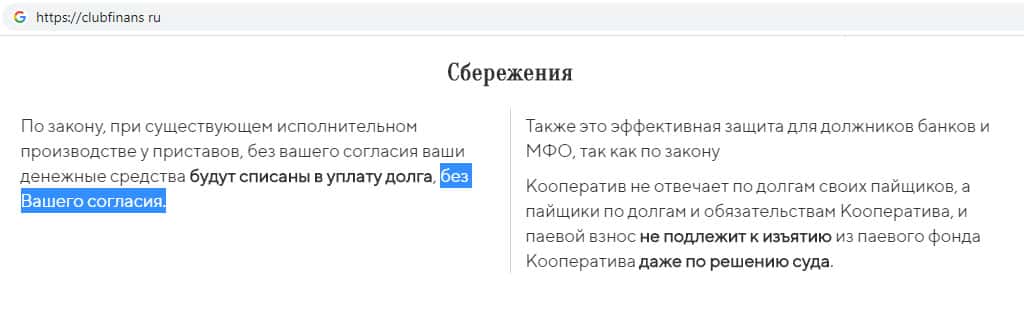 Что рассказывают жулики Клуб Финансовой Защиты о своем потребительском кооперативе?