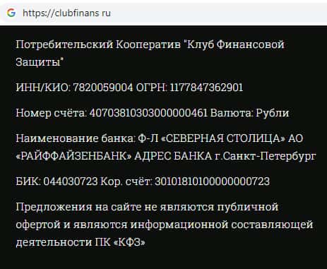 Банковские реквизиты на сайте мошеннической организации Клуб Финансовой Защиты