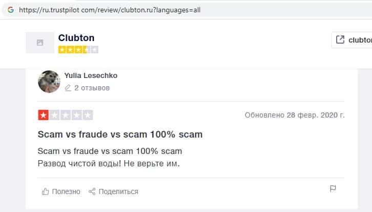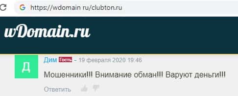 Удаляя свои следы присутствия лохотронщики ClubTon Ru, не смогли почистить всё до конца, так как обманули очень много людей и многие хотят вернуть свои деньги обратно. Гневных комментарий после зачистки осталось мало, но удалось разыскать несколько гневных отзывов о мошеннической деятельности Клуб Тон.