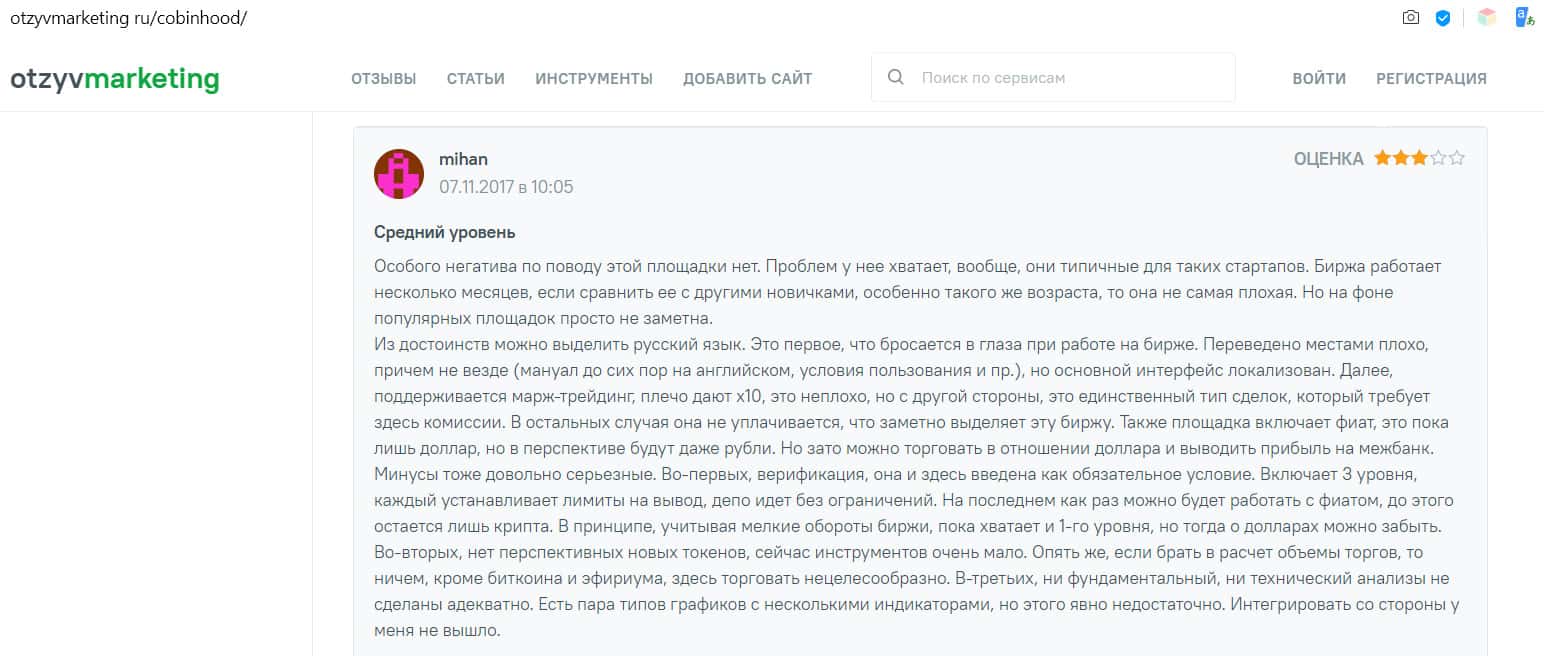 Пользователь с ником Mihan отозвался о псевдобирже Cobinhood следующим образом. Очень много минусов, существуют лимиты на вывод, средства переводятся длительное время. Мало криптоинструментов, торговать особе нечем. Сложная трехуровневая верификация, отсутствует адекватный анализ рынка. Довольно посредственный уровень, по сравнению с другими подобными ресурсами.