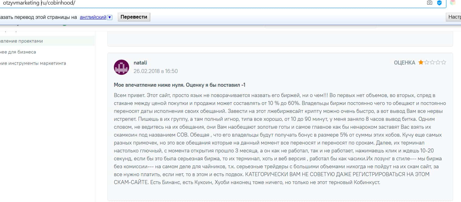 Пользователь Натали, опубликовала свой отзыв об этой жульнической организации на сайте otzyvmarketing, подробно описав все нарушения, которые имеют место на Кобинхуд. Гигантский спред, очень долгий вывод профита, глючный терминал - вот основные причины недовольства клиентов. Кроме этого, постоянные обещания владельцев сайта, которые они и не думают исполнять!