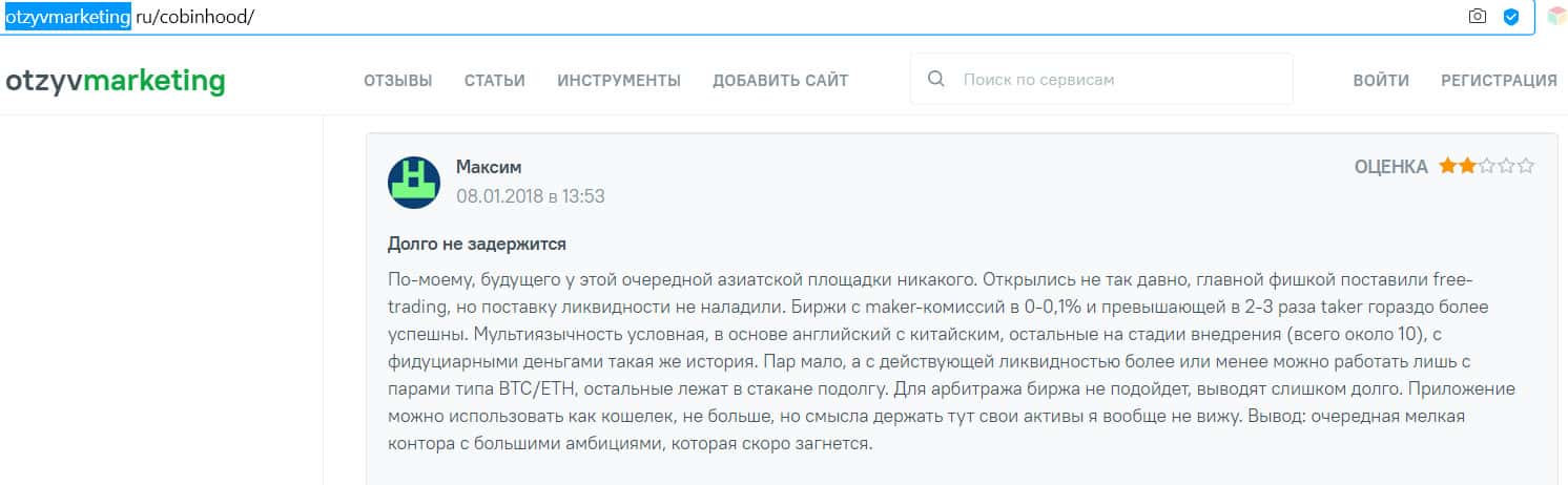 Вот содержание другого отзыва с сайта Отзывмаркетинг, который написал некто Максим: очень мало действующих криптовалютных пар для торговли, вывод прибыли осуществляется долго, недостает русскоязычной поддержки. Вывод такой: биржа Кобинхуд долго на рынке не задержиться, так как амбиций у ее организаторов много, а по факту плохой функционал.
