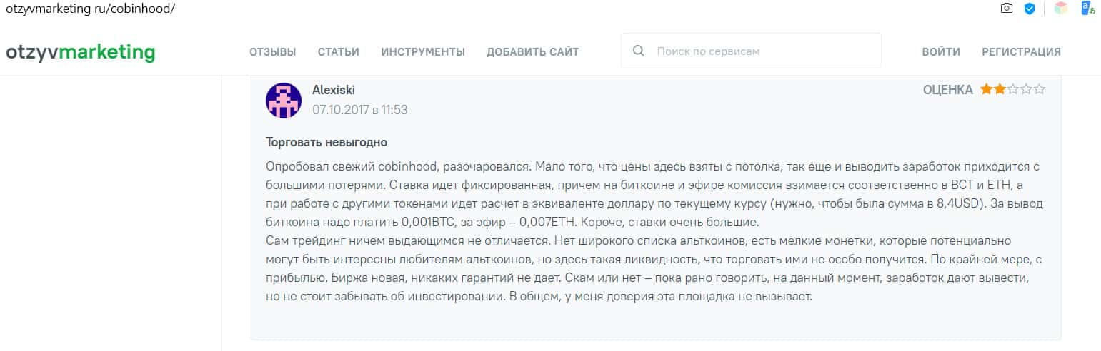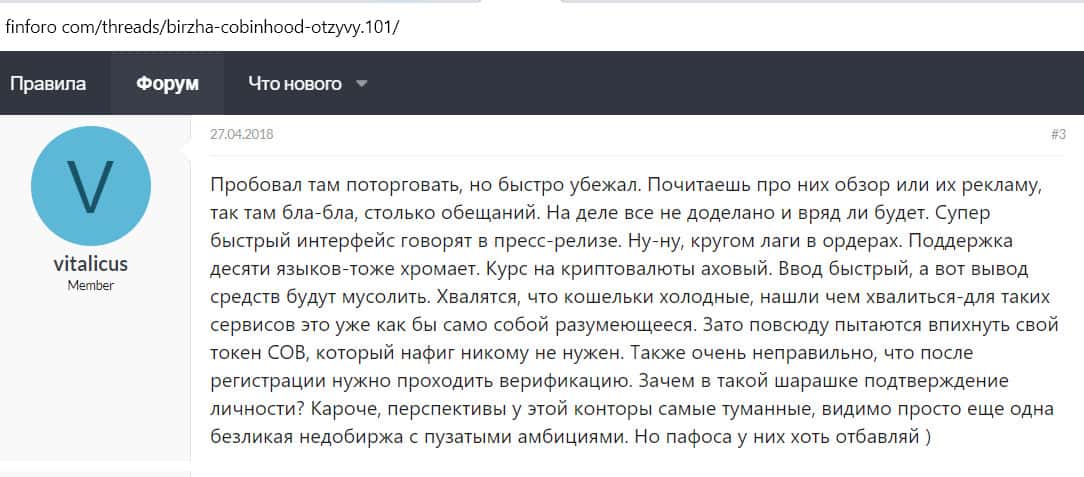 Пользователь Vitalicus, написавший отзыв на сайте finforo.com, признается, что, не успев начать торговать на криптоплощадке Кобинхуд, он сбежал оттуда. Дело в том, что там гораздо больше минусов, чем плюсов. Зачем в этой шарашке трехуровневое подтверждение личности? - спрашивает он. Вывода средств не дождешься, русскоязычная поддержка оставляет желать лучшего, торговать по сути нечем.