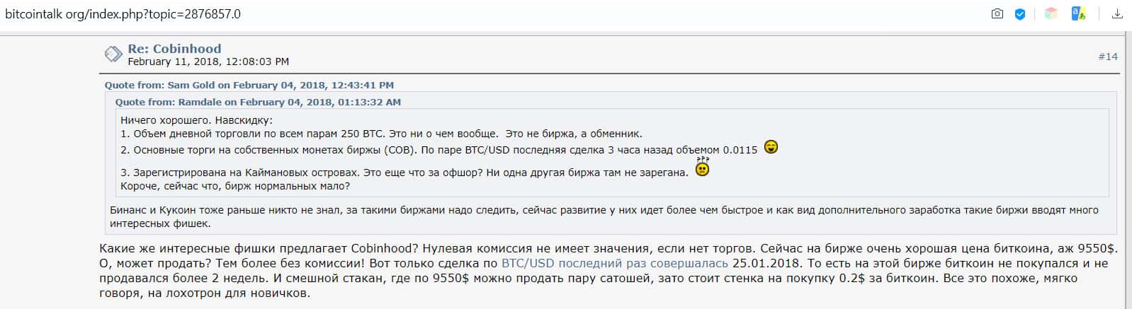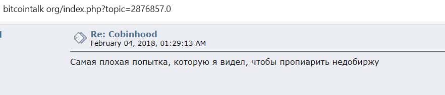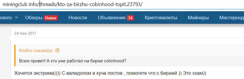На вопрос участника форума miningclub.info, работал ли кто-нибудь с биржей Кобинхуд, пользователь Артем85 дал простой и короткий ответ, что указанная площадка по-просту скам. По комментарию видно, что Артем уже видел в сети кучу отзывов об этих жуликах, из которых стало ясно, что клиенты Кобинхуда, не знают, что случилось с биржей и просят помощи.