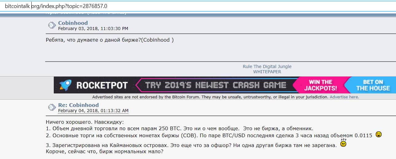 На вопрос человека, заинтересовавшегося конторой Кобинхуд, на форуме bitcointalk org дали подробный ответ. во-первых, там очень маленький объем торговли внутри дня - это указывает на слабую работу биржи. Во-вторых, торгуется, в основном собственный токен, не являющийся сильной монетой. И наконец, вызывает сильные подозрения регистрация данной компании на Каймановых островах, где нет офшорной зоны.