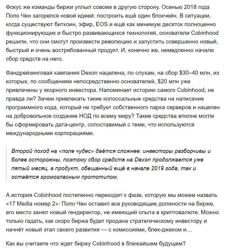 По мнению автора статьи, глава Кобинхуда сейчас разрабатывает новый скам-проект, вместо того, чтобы заниматься существующим проектом. То есть, его целью является не создание действующей криптовалютной биржи, а мошеннических организаций, собирающих огромные деньги со своих клиентов. После этого компания продается или закрывается, а вкладчики остаются у разбитого корыта.