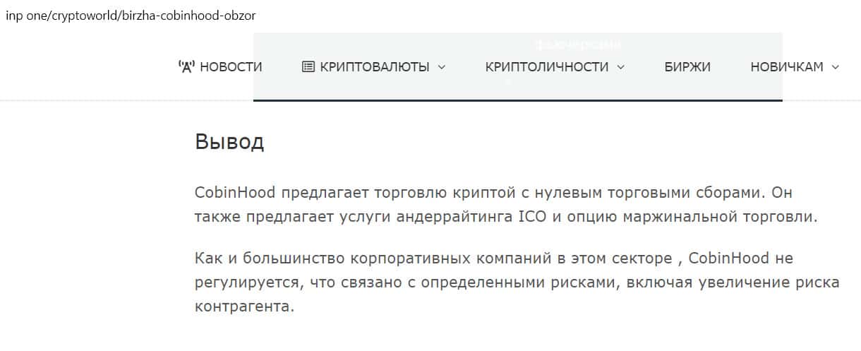 Тщательно промониторив площадку, предлагающую вкладывать деньги в торговлю криптой, сайт пришел к выводу, что риски здесь довольно велики. Ведь подобная деятельность не подпадает под действие финансовых регуляторов, а поэтому никто не будет защищать клиентов Кобинхуда и других лохотронов.