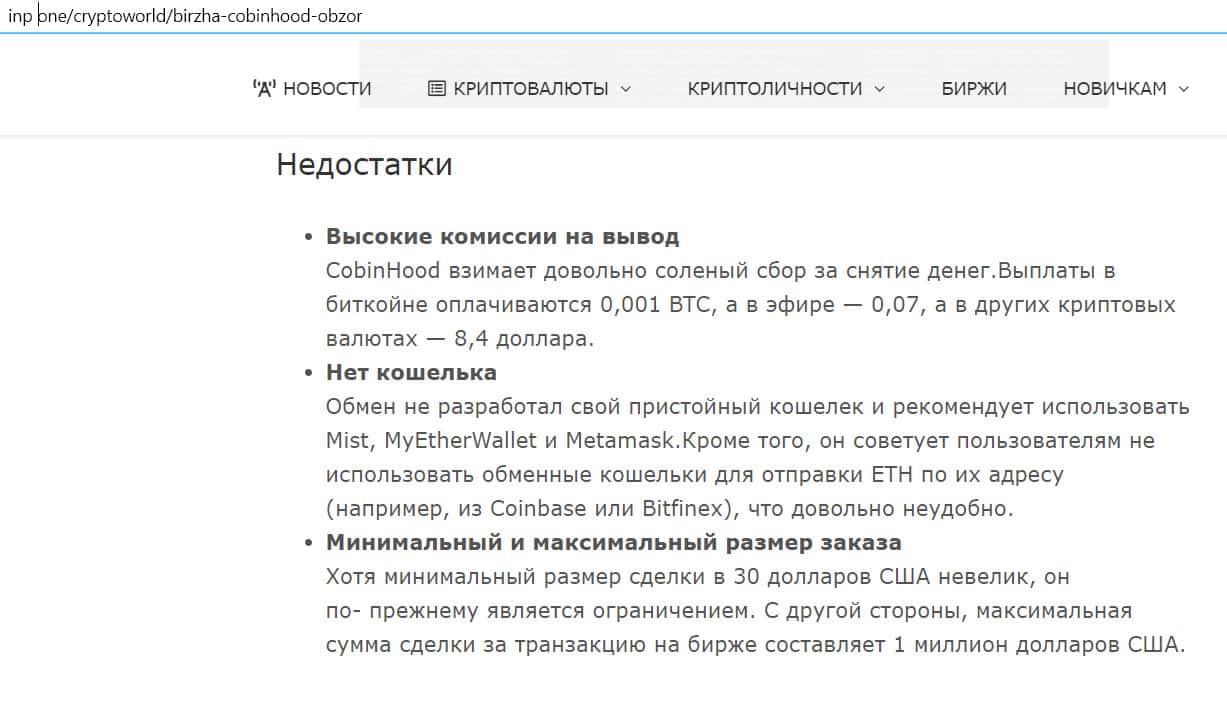 Сайт inp.one провел мониторинг криптобиржи Кобинхуд и выявил некоторые недостатки. Самым главным минусом сайт считает высокий сбор за перевод денег со своего аккаунта. Видимо, это компенсация за отсутствие комиссии со сделок. Также недостатком является ограничение на размер сделки и отсутствие своего электронного кошелька.