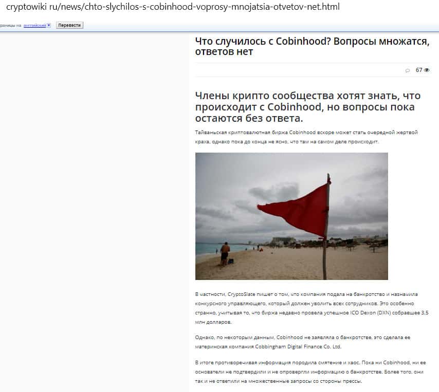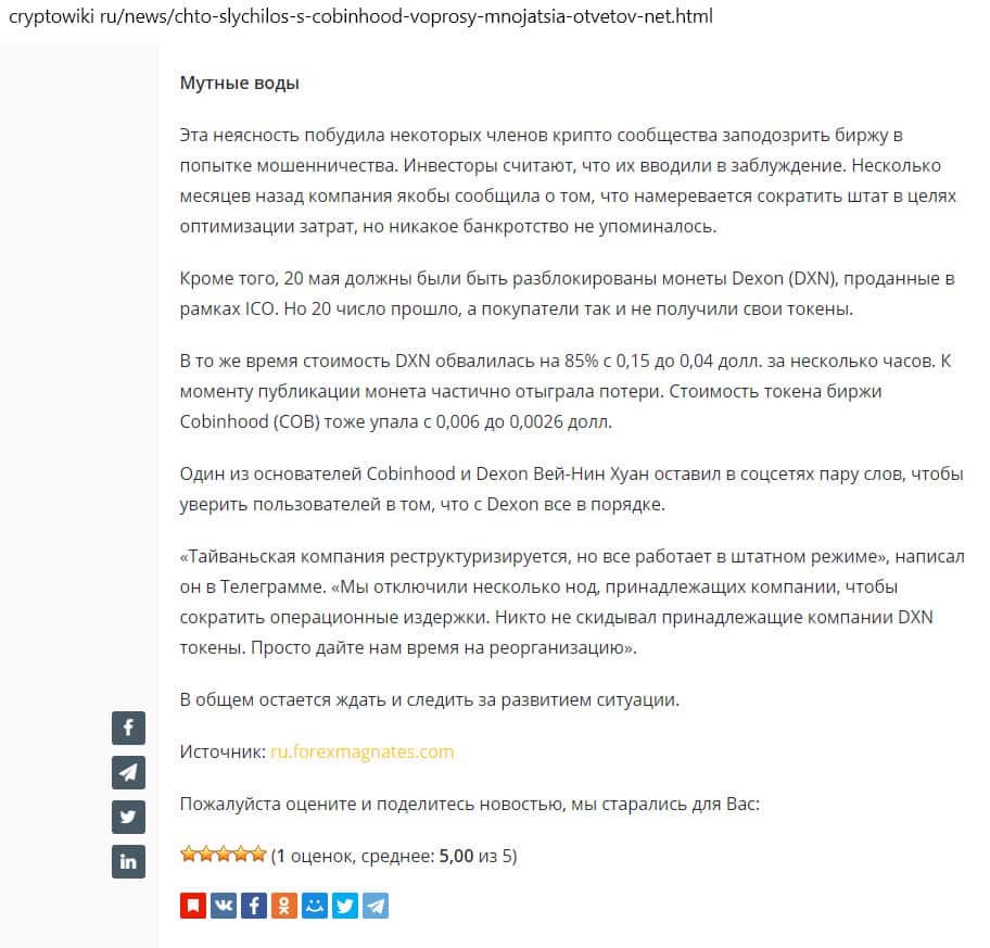 Из заголовка статьи на сайте cryptowiki.ru ясно, что площадка Кобинхуд не оправдала ожидания своих вкладчиков. В прессу просочилась информация о банкротстве компании, которую руководители не подтверждают. В итоге, никто не понимает, что будет происходить на бирже, и что делать клиентам, которые вложили туда свои деньги.