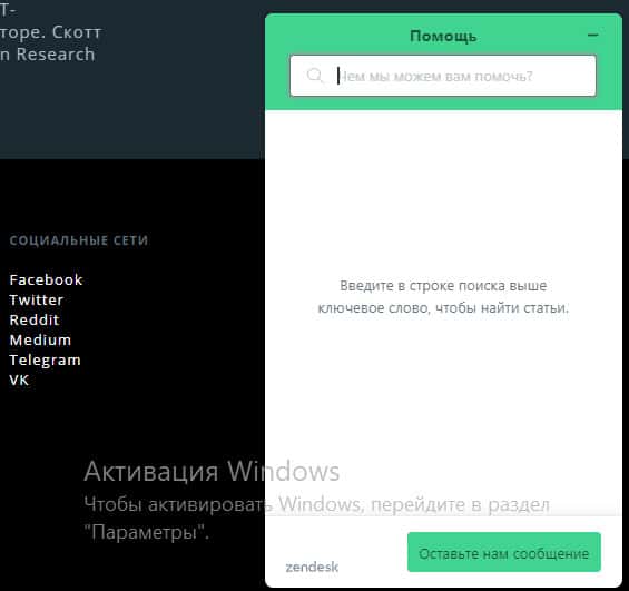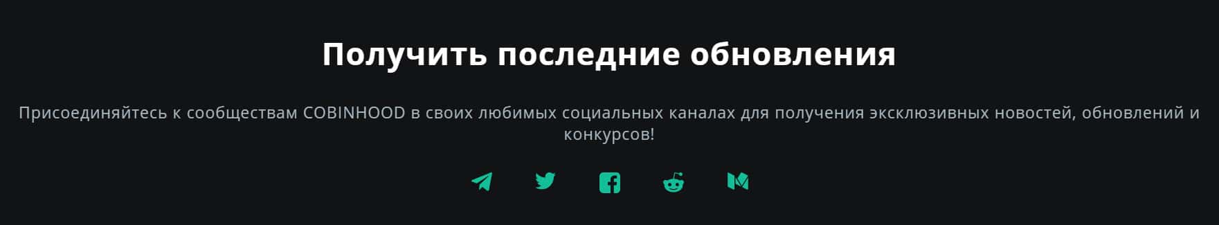 Как и все продвинутые криптобиржи, Cobinhood имеет свои аккаунты в социальных сетях. Это Твиттер, Фейсбук, Reddit, Medium и даже русскоязычные каналы Телеграм и ВКонтакте. Последняя на сайте в виде иконки почему-то не отображается, однако, внизу страницы имеется информация о наличии аккаунта и там. Перед иконками соцсетей завлекающий призыв участвовать в конкурсах и тому подобной ерунде.