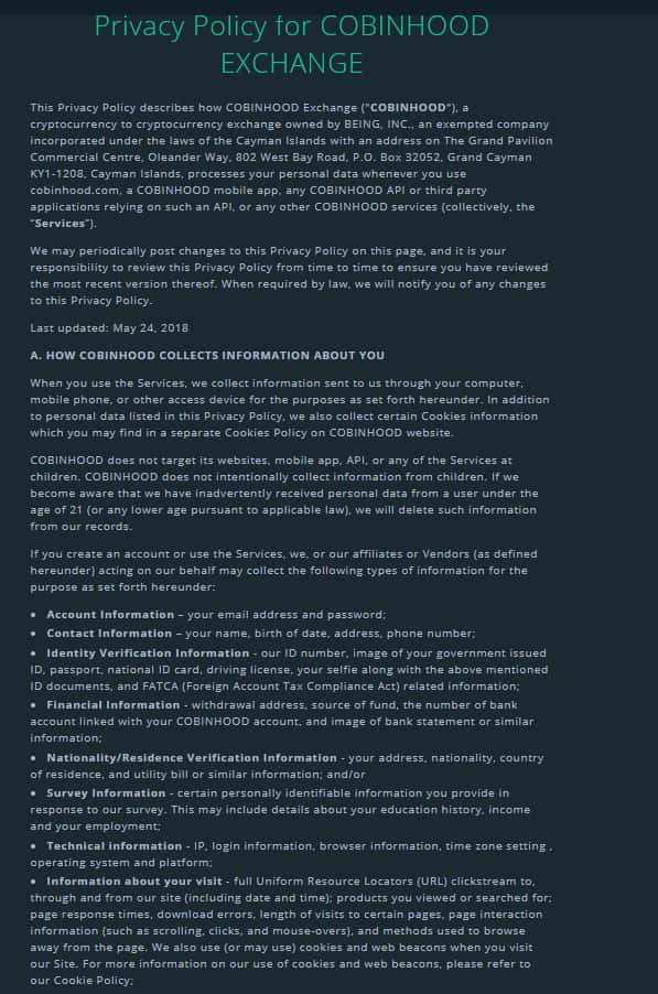 Криптовалютная биржа Кобинхуд имеет политику конфиденциальности, но документ доступен только на английском языке. Если вы хотите узнать, что там написано, воспользуйтесь переводчиком. Однако, это итак ясно, что организаторы пишут там, что не занимаются сбором личных данных с клиентов. На самом деле все с точностью до наоборот.