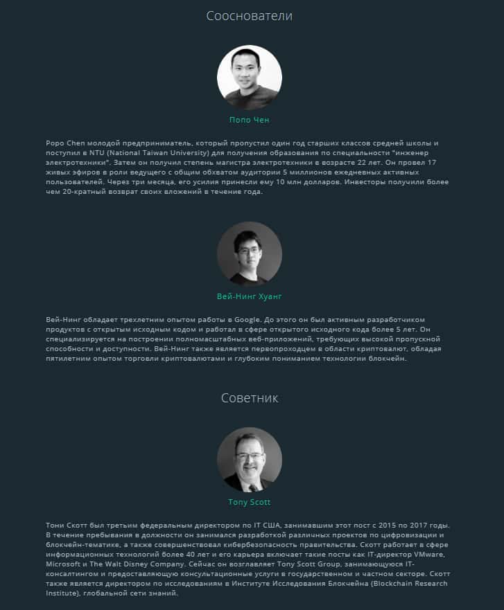 Как ни странно, руководители этого скам-проекта вовсе не скрывают свои лица. Наоборот, они смело выкладывают свои фото на сайт, так как полностью уверены в своей безнаказанности. Мы можем видеть фотографию самого Попо Чена, его друга Вей Нинг-Хуанга, а также сооснователя Тони Скотта.