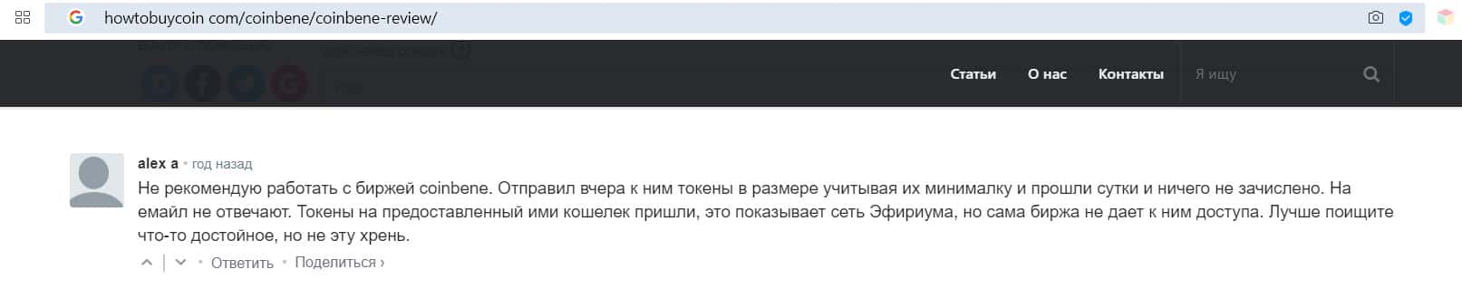 Пользователь Alex в своем отзыве на сайте howtobuycoin com назвал биржу Коин Бене недостойной внимания. Он, также, как и другие клиенты, не смог дождаться перевода средств на свой кошелек. Токены были получены жуликами из скам проекта Коин Бене, но не зачислены на учетную запись пользователя.