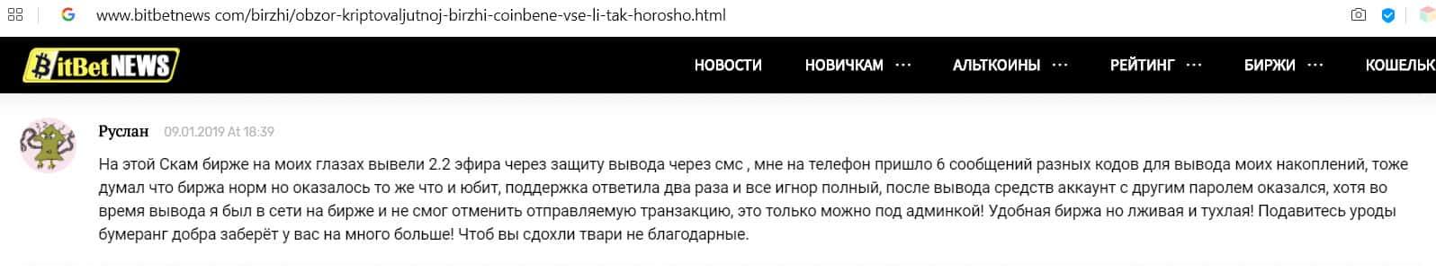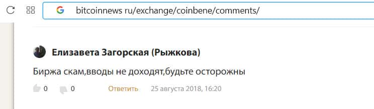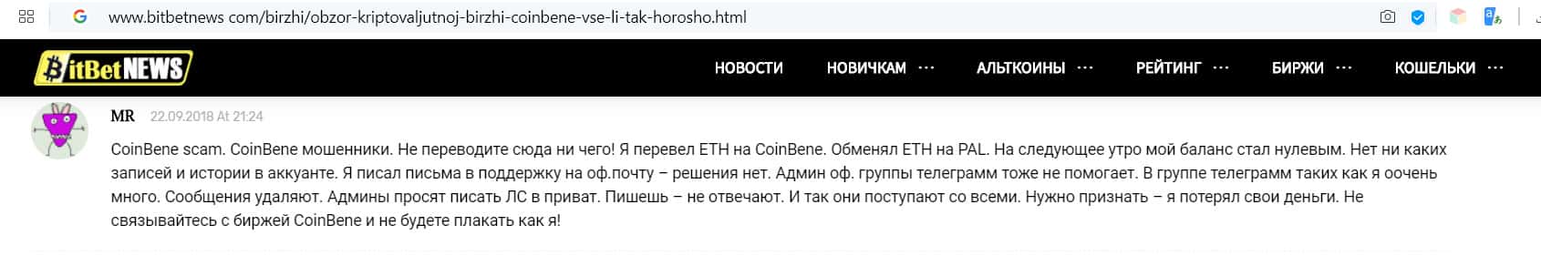 - Комментарий англоязычного пользователя о бирже Коин Бене: держитесь подальше от этого скама!