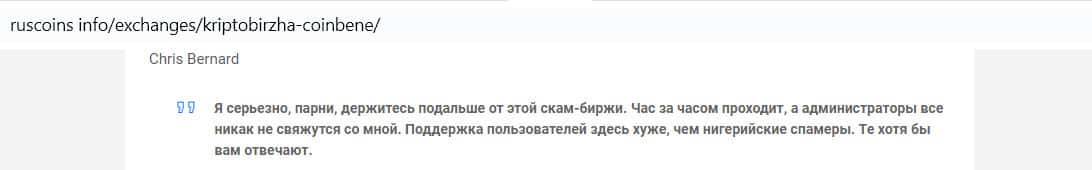 Сайт Рускоинсинфо опубликовал отзыв англоязычного трейдера о криптобирже Коин Бене. Бывший клиент предупреждает о том, чтобы люди не связывались с этим скам проектом и держались от него подальше. Крис сравнил техподдержку с нигерийскими спамерами, так как она ничего не делает и игнорит клиентов.