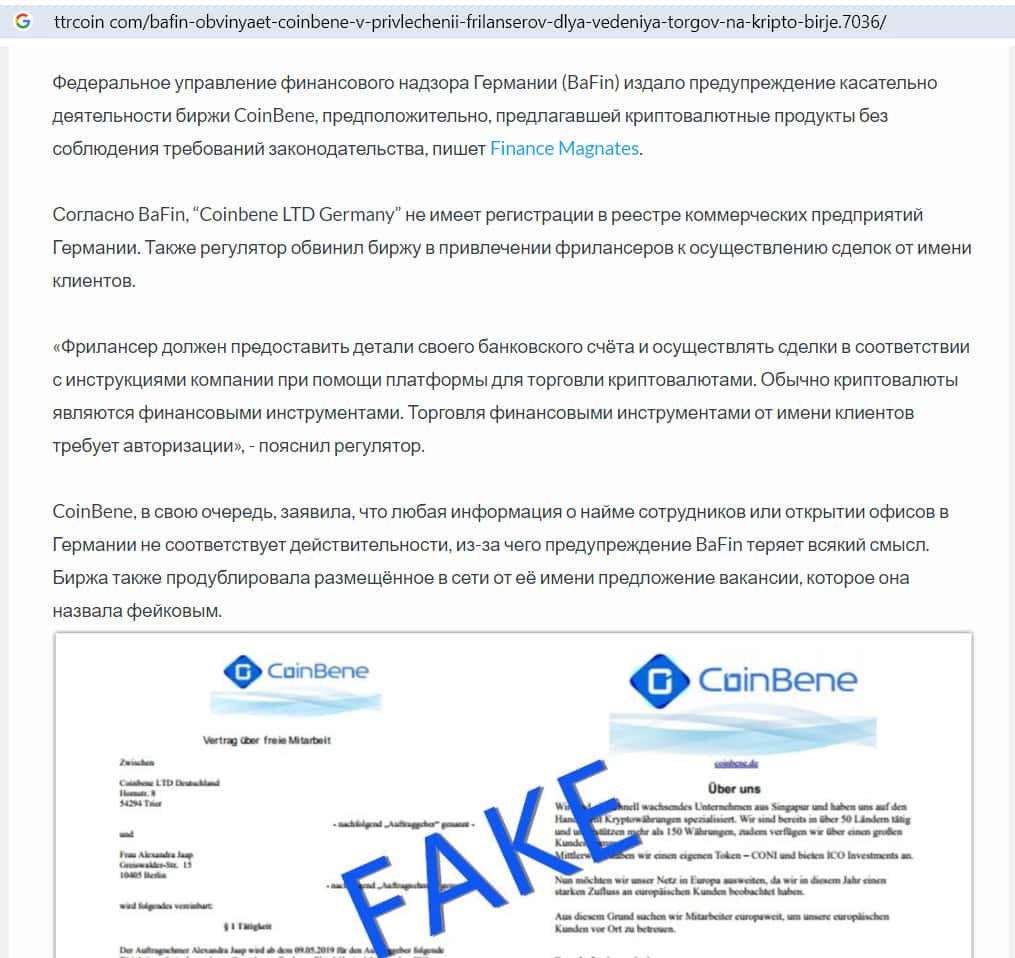 Финансовый регулятор Германии BaFin выдал предупреждение бирже Коин Бене, из-за того, что у нее нет лицензии на проведение финансовых операций. Также, имеются подозрения в том, что организаторы привлекали фрилансеров для торговли в целях накрутки объемов. В доказательства они предоставили объявления, размещенные в сети.