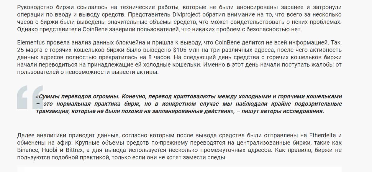 Согласно исследованиям, с биржи Коин Бене всего за несколько часов были выведены значительные средства, что говорит о явных махинациях владельцев проекта. В эти же дни поступали заявления от пользователей о невозможности вывода токенов. Криптовалютное сообщество пришло к выводу, что Коин Бене использует средства клиентов не по назначению.